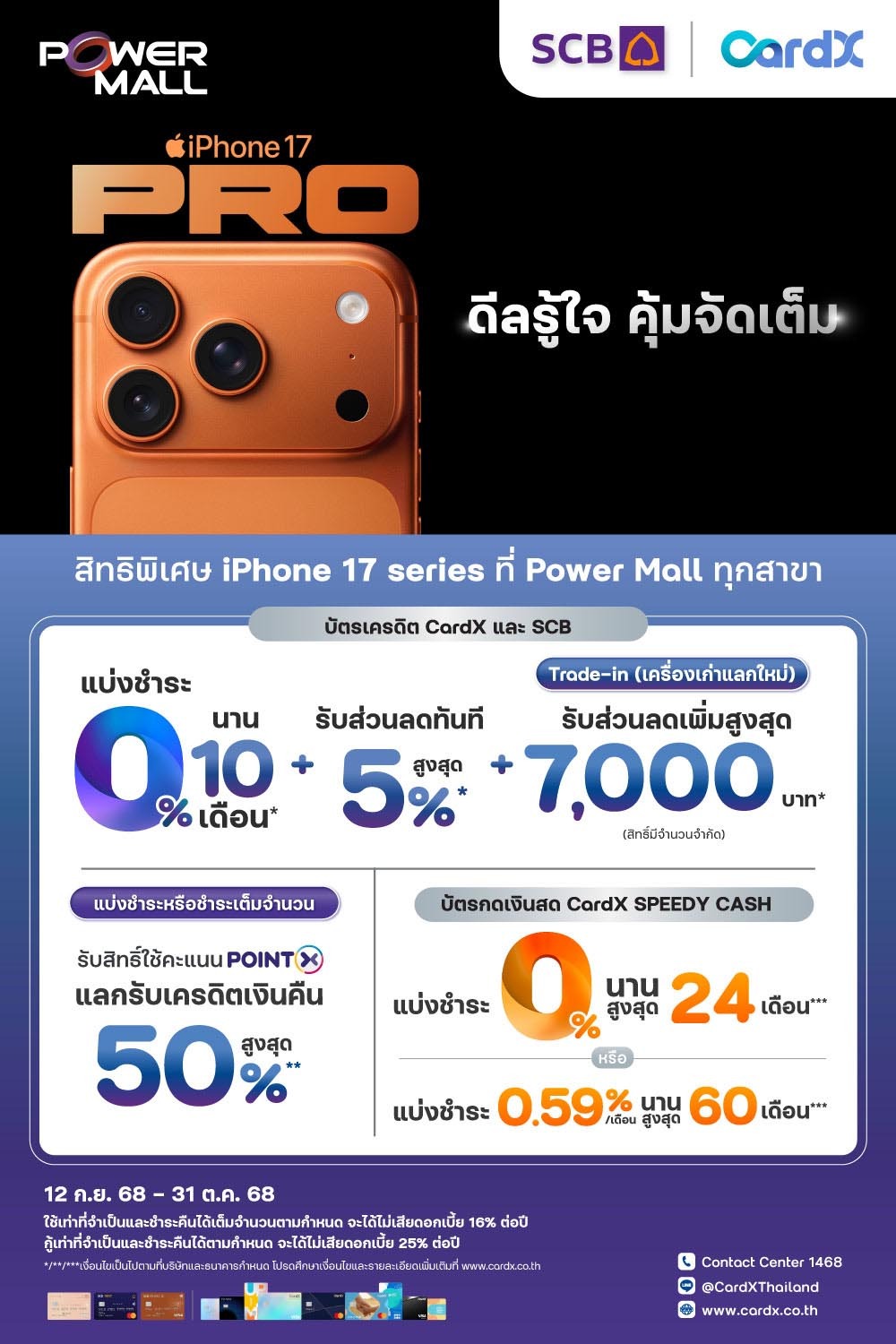iPhone 17 บัตรเครดิต CardX l SCB ลดเพิ่มสูงสุด 5% + แลกรับเครดิตเงินคืนสูงสุด 50% 12 ก.ย. - 31 ต.ค. 2568 SCB