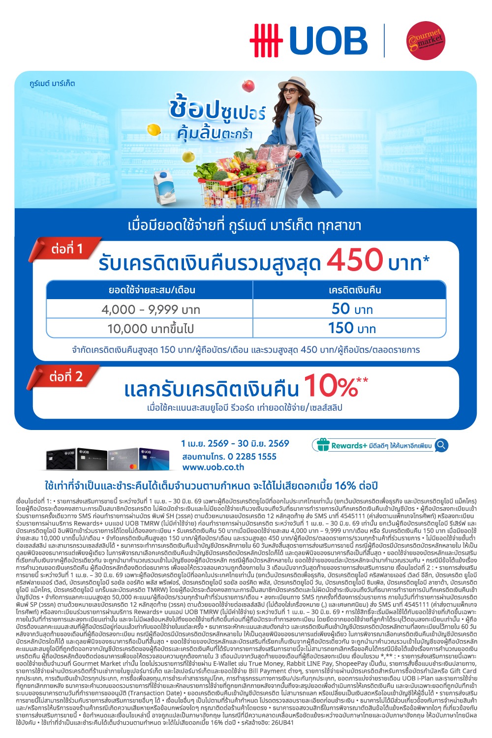 บัตรเครดิต UOB รับเครดิตเงินคืนรวมสูงสุด 450 บาท