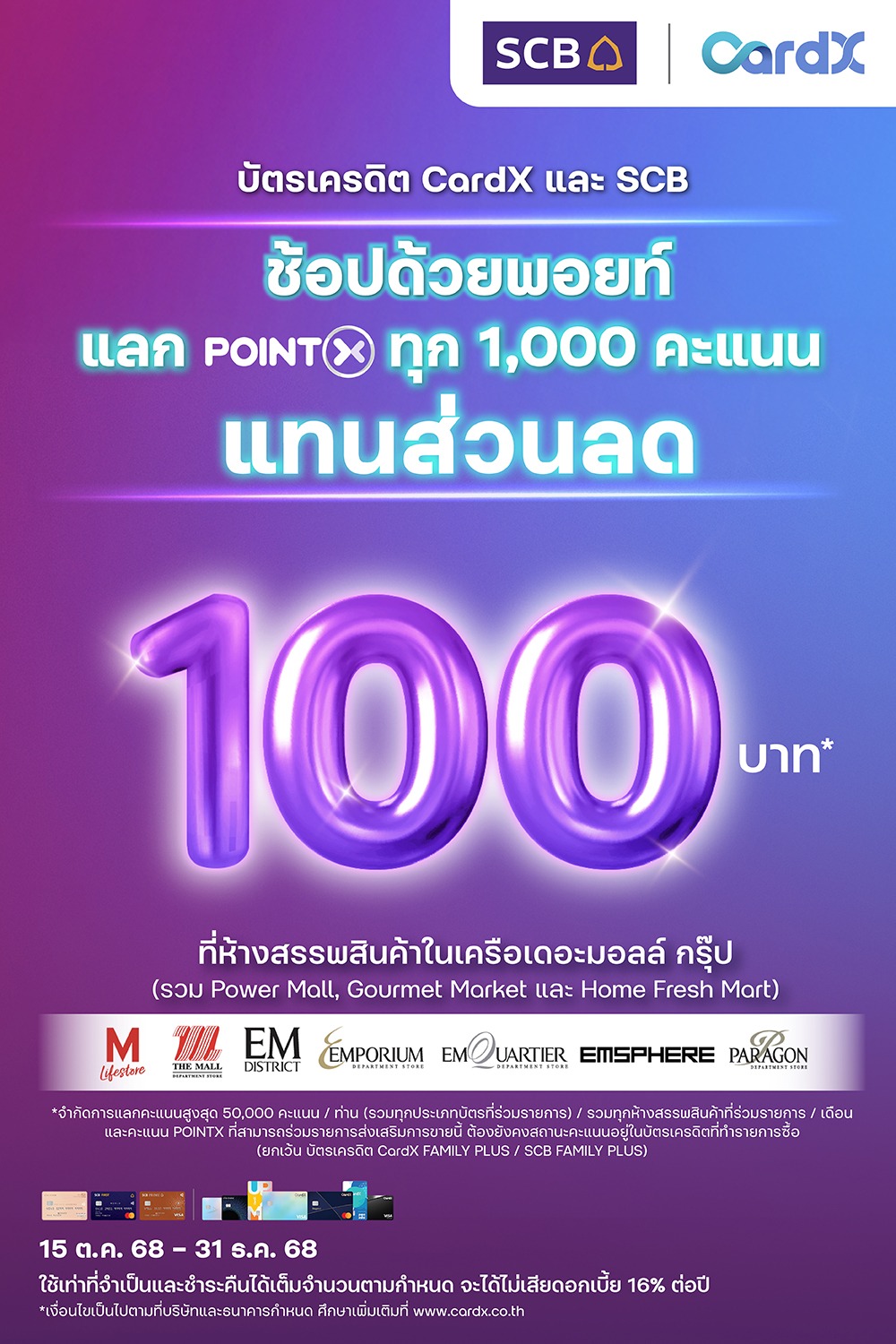 บัตรเครดิต CardX แลกทุก 1,000 คะแนน รับส่วนลด 100 บาท