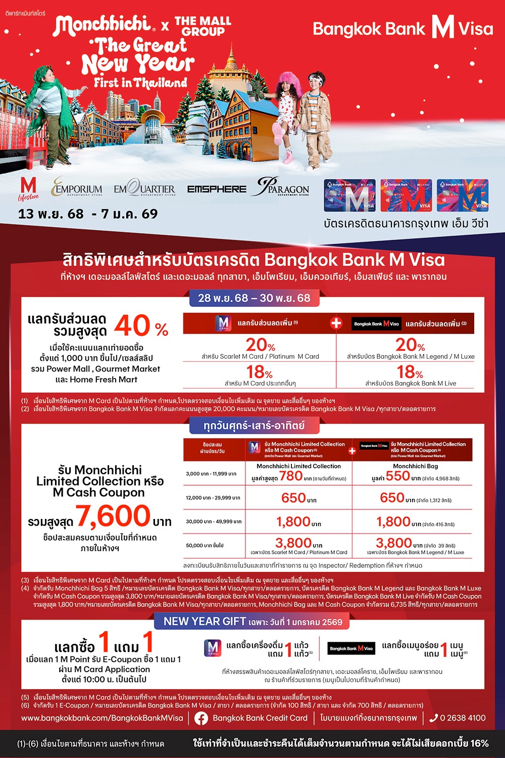 (2)(3) Monchhichi Bag Limited Collection และ M Cash Coupon จำกัดรวม 6,735 สิทธิ์/ทุกสาขา/ตลอดรายการ, นำใบเสร็จ เซลล์สลิป และบัตรเครดิตที่มีชื่อ-สกุลตรงกับหมายเลขบัตร M Card มาลงทะเบียนรับสิทธิ์ ภายในวันและสาขาที่ทำรายการ ณ จุดแลกรับของสมนาคุณที่ห้างฯ กำหนด, สาขาเอ็มโพเรียม เอ็มควอเทียร์ และเอ็มสเฟียร์ สามารถรวมใบเสร็จกันได้, ใบเสร็จหรือเซลส์สลิปบัตรเครดิตที่ใช้ลงทะเบียนรับสิทธิ์ไปแล้วไม่สามารถนำไปใช้รับสิทธิ์ร่วมกับรายการส่งเสริมการขายอื่นของบัตรเครดิต Bangkok Bank M Visa ได้อีก, M Cash Coupon หมดเขตการใช้ในวันที่ 31 มี.ค. 69, สงวนสิทธิ์การใช้ M Cash Coupon สำหรับซื้อสินค้าในครั้งถัดไปคู่กับบัตรเครดิต Bangkok Bank M Visa เท่านั้น