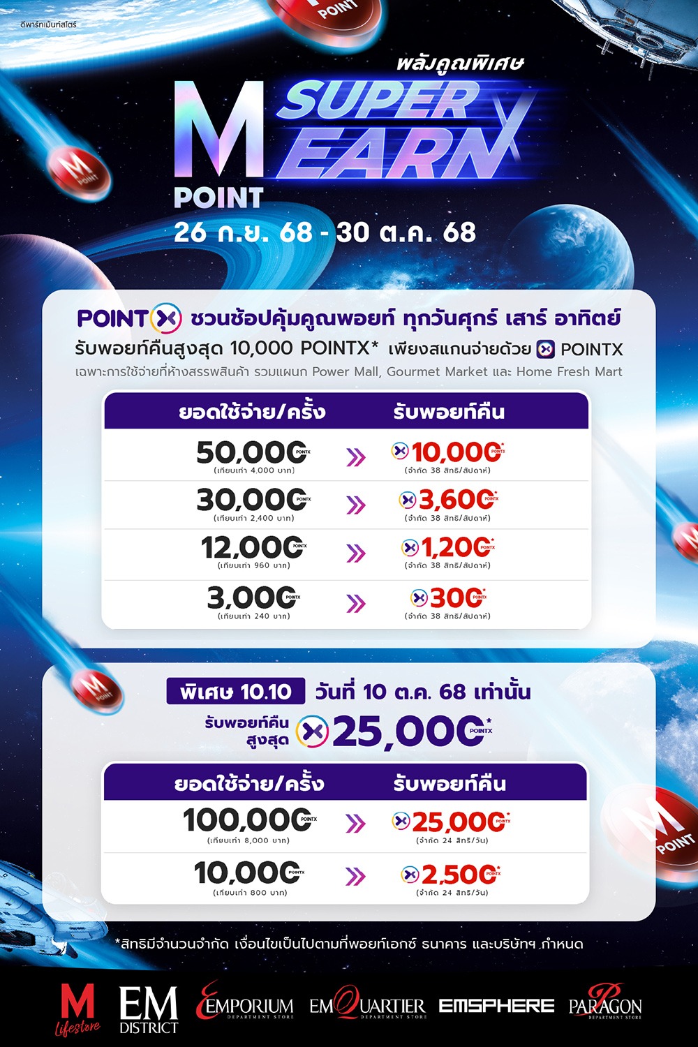 ใช้จ่ายตั้งแต่ 50,000 คะแนน รับคะแนนสะสมพิเศษ 10,000 คะแนน | จำกัดสิทธิ์/สาขา/สัปดาห์ | 15 | 15 | 8 | 38 |