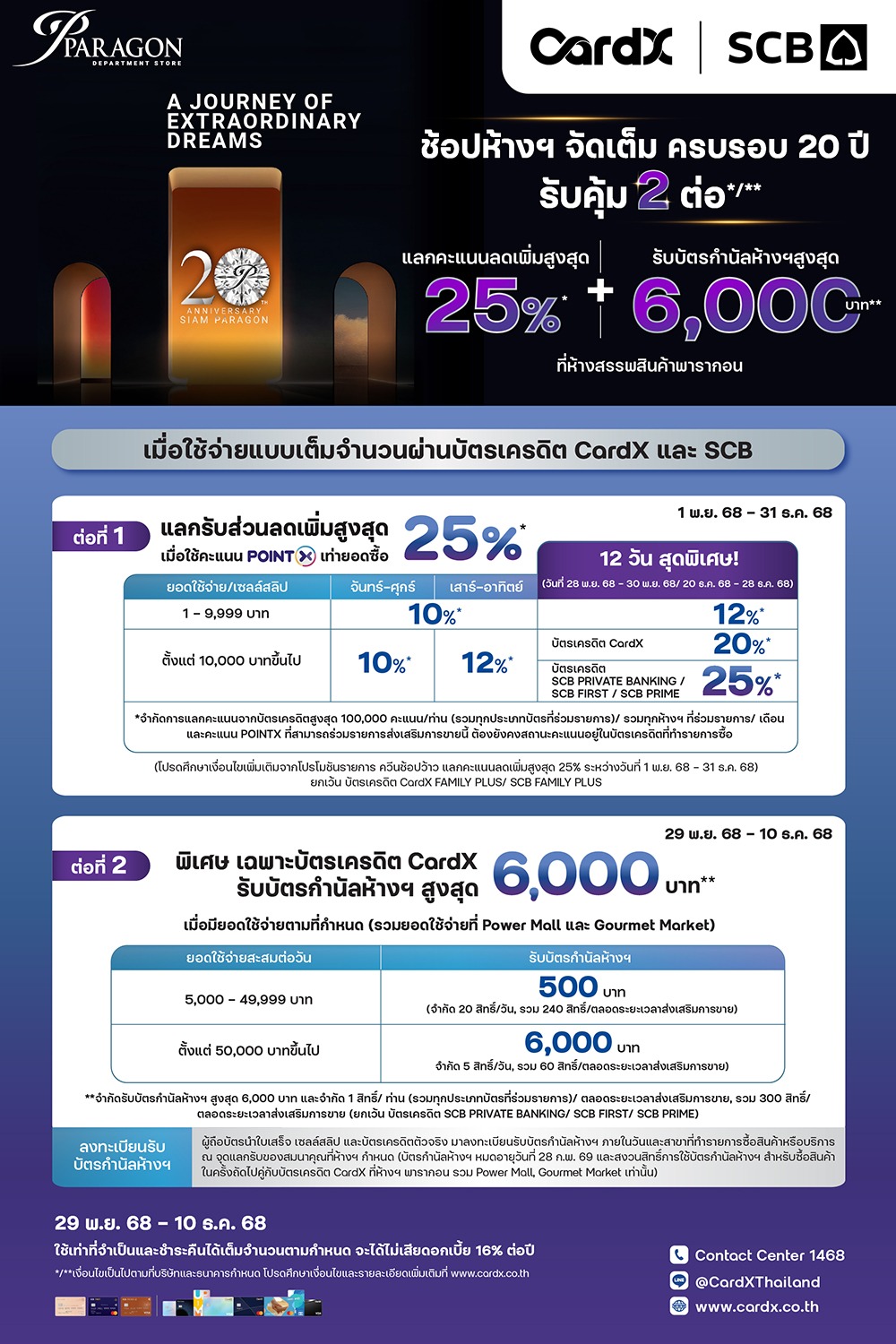 - สงวนสิทธิ์สำหรับใช้ซื้อสินค้าครั้งถัดไปที่ห้างสรรพสินค้าพารากอน รวม Power Mall และ Gourmet Market คู่กับบัตรเครดิต ttbเท่านั้น