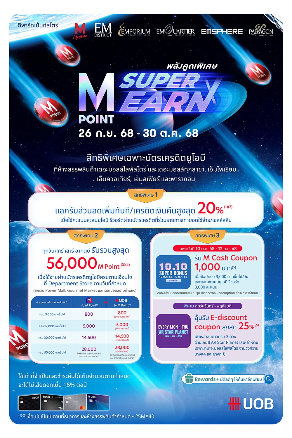 • สิทธิพิเศษเฉพาะผู้ถือบัตรเครดิตยูโอบีที่เป็นสมาชิก M Card สะสม Star Planet ครบ 3 ดวง ผ่าน M Card Application ณ พื้นที่กิจกรรมที่ห้างฯ กำหนด ลุ้นรับ E-Discount Coupon สูงสุด 25% สำหรับใช้เป็นส่วนลดในการซื้อสินค้าตั้งแต่ 2,000 บาท/เซลส์สลิป และชำระผ่านบัตรเครดิต UOB ดังนี้