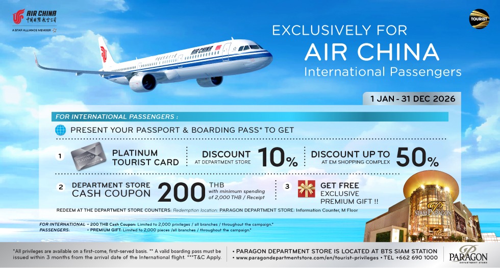 Pick up or download your free Tourist Discount Card at our information counter M FL and you’ll enjoy a 5% discount at the department store Get VAT Refund with minimum shopping of 2,000 Baht.