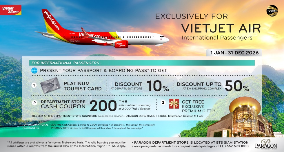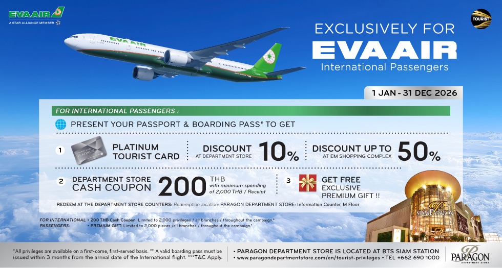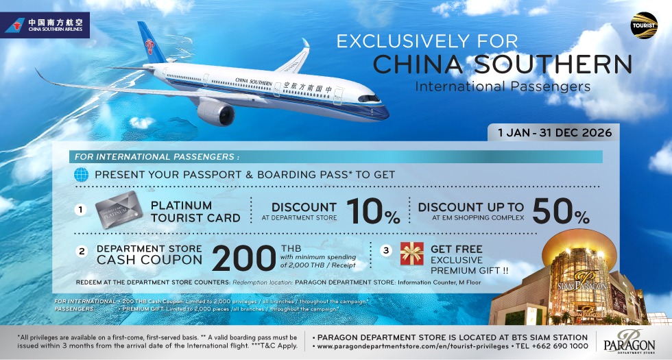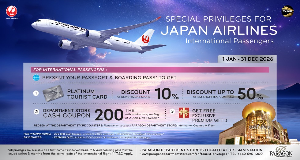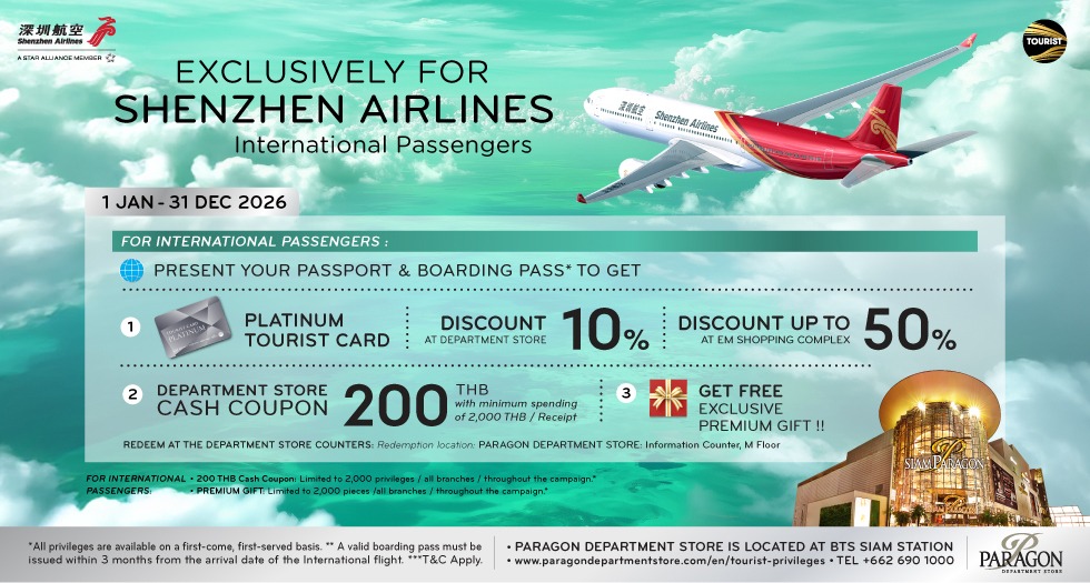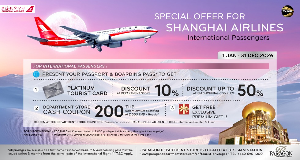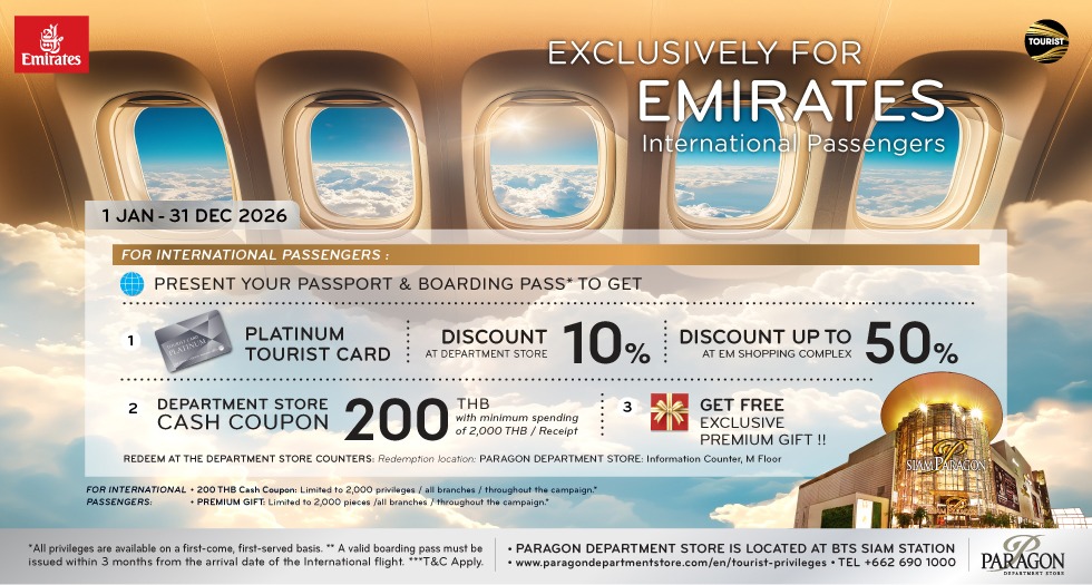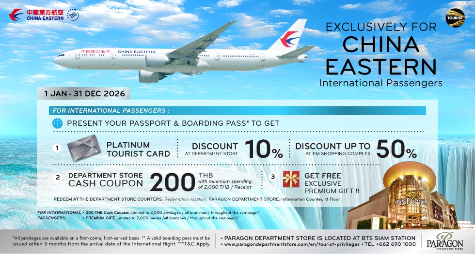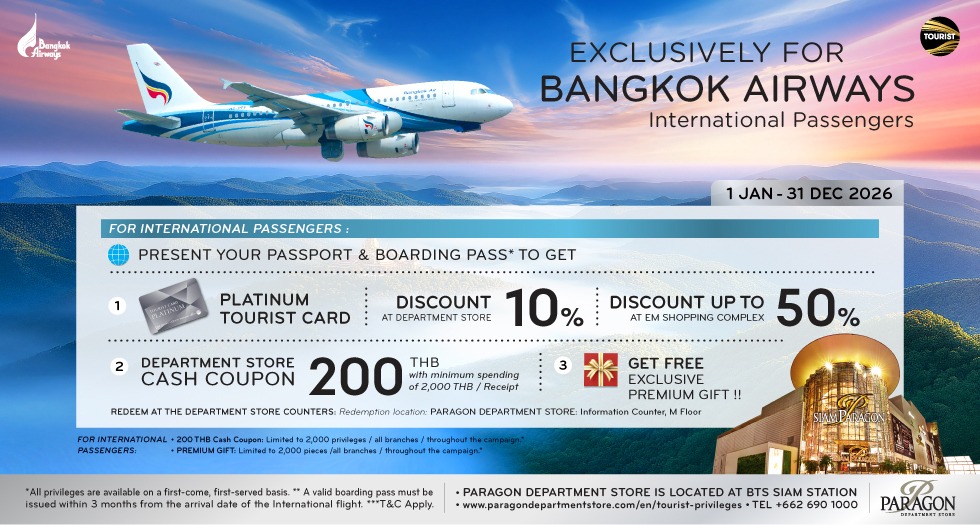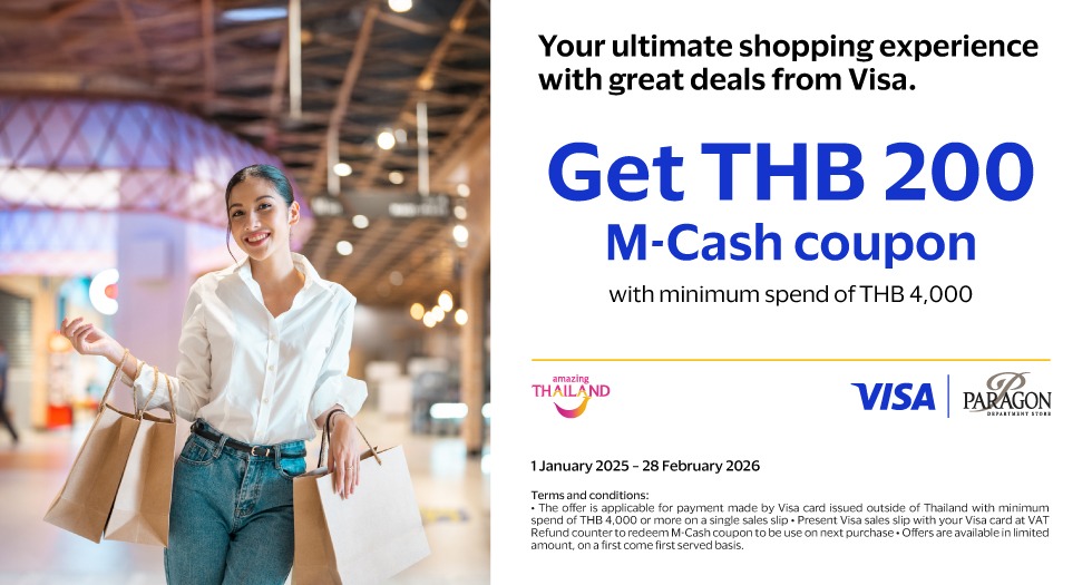 simply present your receipt, passport, and BTS Card to receive a 200 Baht M Cash Coupon at Paragon Department Store.