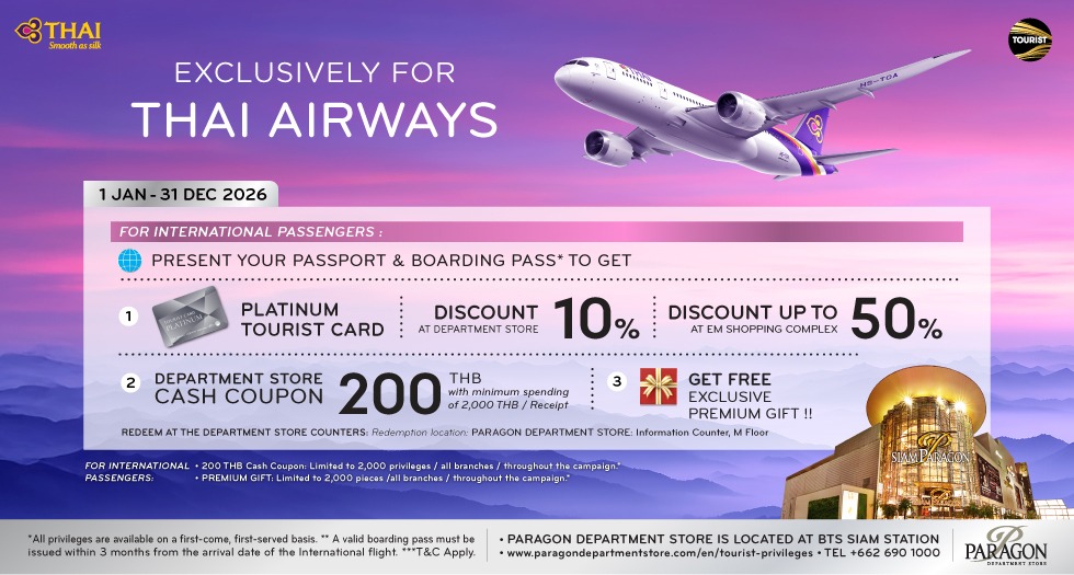 1.Receive 5%* discount on regular priced merchandises in Department Store, Gourmet Market, Selected Thai Designers, Sport Mall, Another Story, Another Man Story and The Shop (Spa products only).