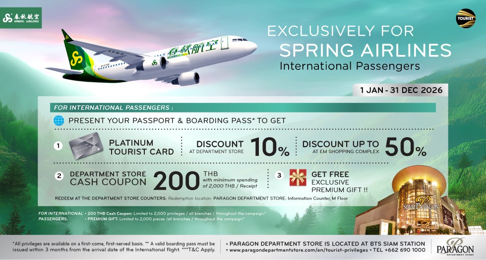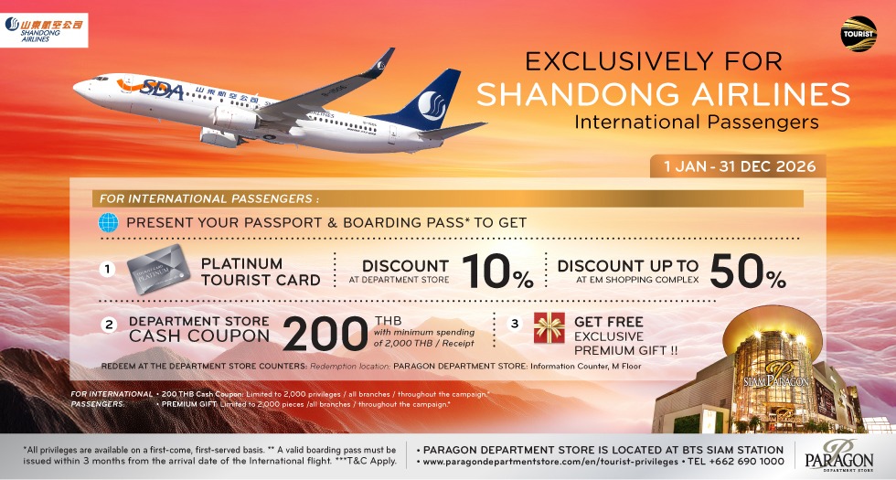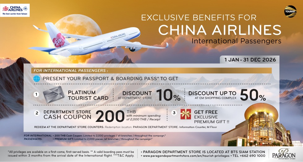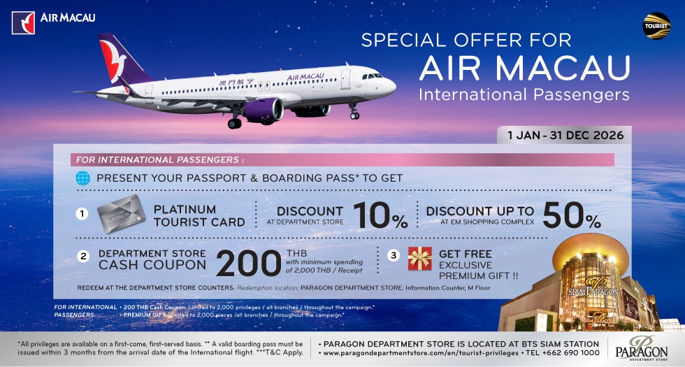 Accumulated spending in department stores (exclude Power Mall, Gourmet Market, and non-participating products) at a minimum of 20,000 Baht* to receive M Cash valued at 1,000 Baht* and accumulated spending in department stores (exclude Power Mall, Gourmet Market, and non-participating products) at a minimum of 8,000 Baht* to receive Monchhichi Collection Bottle valued at 700 Baht* or Monchhichi Blanket valued at 780 Baht* at Paragon Department Store. Furthermore, get extra privileges when you use participating credit cards for your purchases.