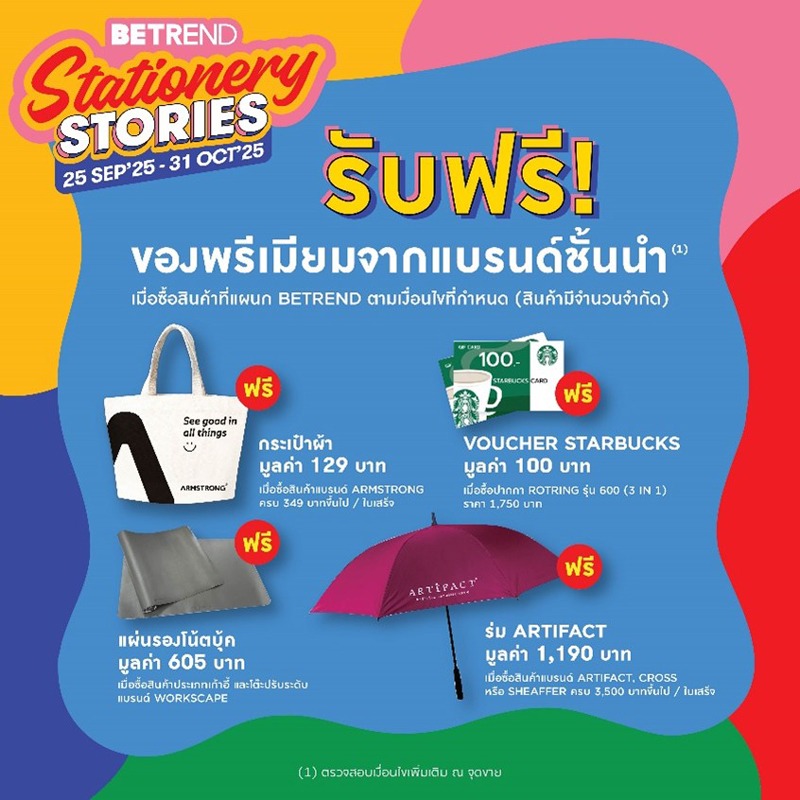 ****** แสดงใบเสร็จที่มียอดซื้อสินค้าในแผนก BeTrend (Be-Stationery & Office Supplies) ครบ 1,500 บาท / ใบเสร็จ แก่พนักงานขาย เพื่อรับของสมนาคุณ ที่แผนก BeTrend เดอะมอลล์ไลฟ์สโตร์ ท่าพระ, งามวงศ์วาน, บางแค, บางกะปิ, เดอะมอลล์ โคราช, เอ็มโพเรียม และพารากอน วันที่ 1 ต.ค. 68 - 31 ต.ค. 68 • เฉพาะแบรนด์ และสินค้าที่ร่วมรายการในวัน เวลา และสาขาที่กำหนด • จำกัด 1 สิทธิ์ / ใบเสร็จ / 1 ท่าน • สินค้ามีจำนวนจำกัด และไม่รับปลี่ยนหรือแลกเป็นเงินสด • บริษัทของสงวนสิทธิ์ในการเปลี่ยนแปลงเงื่อนไข โดยไม่ต้องแจ้งให้ทราบล่วงหน้า • ตรวจสอบเงื่อนไขเพิ่มเติม ณ จุดขาย