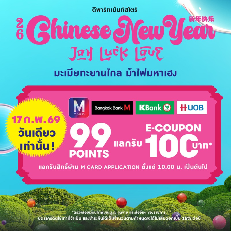 - ผู้ถือบัตรเครดิต Bangkok Bank M Visa กดรับสิทธิ์แลก 99 M Point รับ E-Coupon อั่งเปา 100 บาท (สำหรับใช้ซื้อสินค้าตั้งแต่ 500 บาทขึ้นไป/เซลส์สลิป) ผ่าน M Card Application เฉพาะวันที่ 17 ก.พ. 69 ตั้งแต่เวลา 10.00 น. เป็นต้นไป