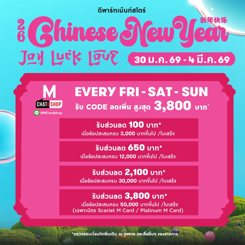 13. Code ลดเพิ่ม ช่องทาง M Chat & Shop สามารถใช้ได้ระหว่างวันที่ 30 มกราคม 2569 - 1 กุมภาพันธ์ 2569 / 6-8 กุมภาพันธ์ 2569 / 13-15 กุมภาพันธ์ 2569 / 20-22 กุมภาพันธ์ 2569 / 27 กุมภาพันธ์ 2568 – 1 มีนาคม 2569 (15 วัน)