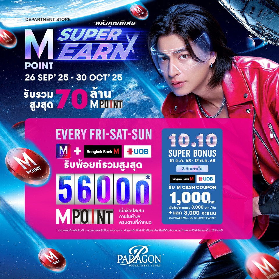 1. ทุกวันศุกร์ - เสาร์ - อาทิตย์ วันที่ 26– 28 กันยายน 2568 / 3-5 / 10-12 / 17-19 / 24-26 ตุลาคม 2568 (15 วัน) รับพ้อยท์รวมสูงสุด 56,000 M POINT
